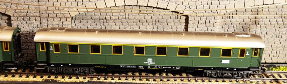 mit dem folgenden Waggon die vier Reichsbahn-Wagen aus der DDR zu einem Zug