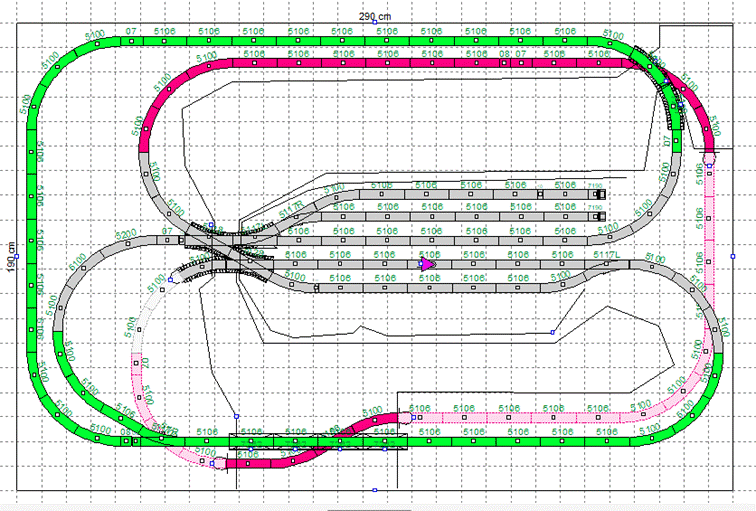 Niveau von zirka 6,5 cm Grün: Ebene der oberen Streckenführung
