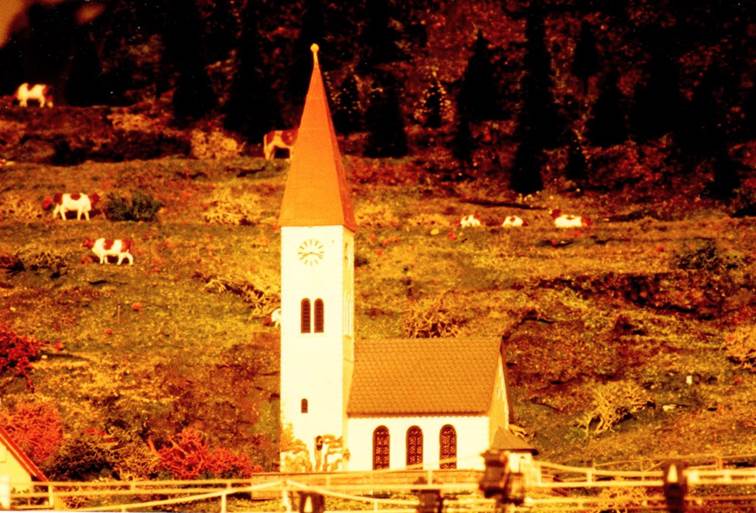 Bahnhof und der Kirche Kühe weiden am Berghang hinter der