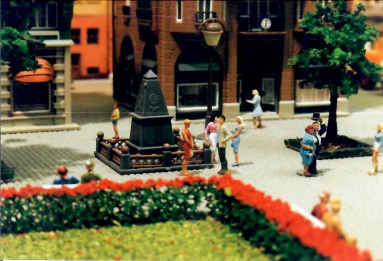 Bahnhofsvorplatz das Gefallenen-Denkmal, eine Grünanlage und lebhaftes