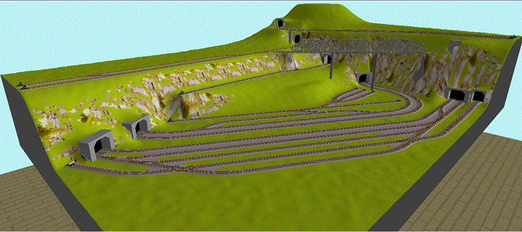 noch über die Viadukt-Brücke und dann in den Bahnhof Talheim. Diese 3D-Simulation der Anlage ist aus
