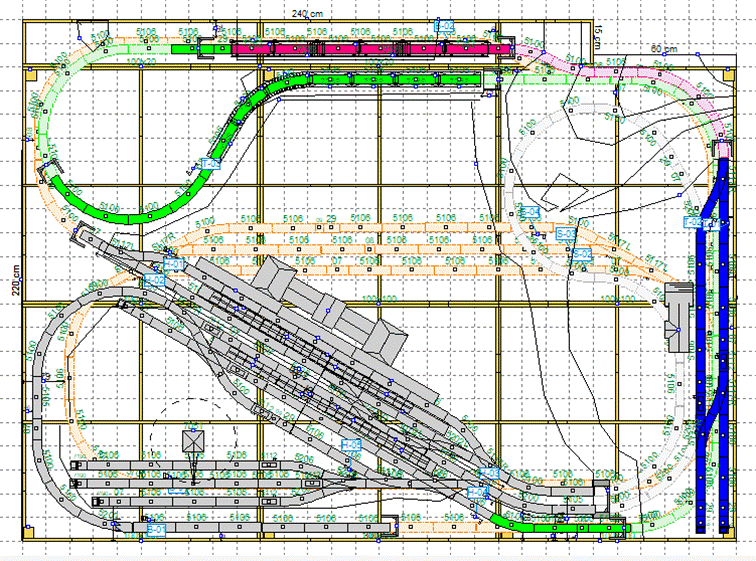 Gleismaterial. Hier sind alle Ebenen angezeigt: Rosa: Tunnelstrecke mit