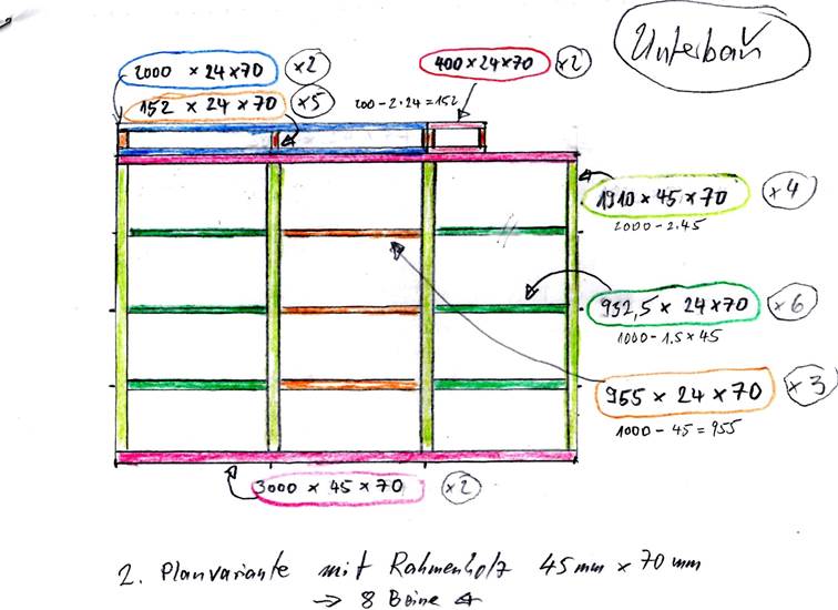 Rahmenhölzern von 45 mm x 45 mm jeweils vorne und hinten. Diese sind 70 cm lang