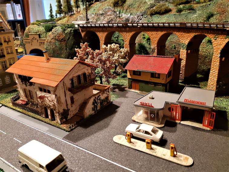 der rechten Anlagenkante. Dort wird ein kleiner Bahnhof in einem ländlichen